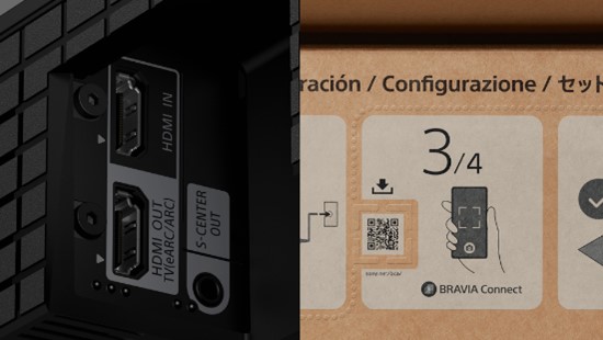 To help visually impaired set up BRAVIA Theatre home audio products[14], a raised square frame on the package indicates a QR code[15] for the BRAVIA Connect app[16], which offers screen reader support. Tactile dots on the back panel of BRAVIA Theatre Bar 9 and 8 indicate the eARC HDMI terminal for connecting to a TV.